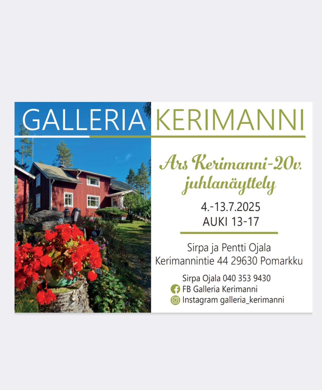 Galleria Kerimanni viettää nimeämisensä 20.vuotis juhlavuotta Valokuvaaja Sirpa OjalaGalleria Kerimannin 20-vuotisjuhlanäyttely. Taidetta vuosien varrelta, kultakuppikahvila ja pihamökin kirppis.