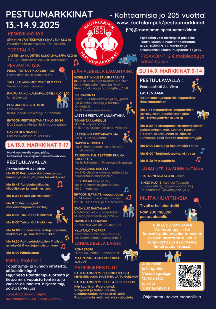 Rautalammin perinteikkäät, yli 200-vuotiaat Pestuumarkkinat järjestetään aina syyskuun toinen viikonloppu, vuonna 2025 siis 13.-14.9.! Pestuuviikolla ja viikonloppuna on paljon eri tapahtumia tapahtuman sisällä, iloisia kohtaamisia ja todellista markkinatunnelmaa!