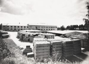 Paraisten Kalkkivuori Oyn valmistamia asbestituotteita tehtaan pihassa