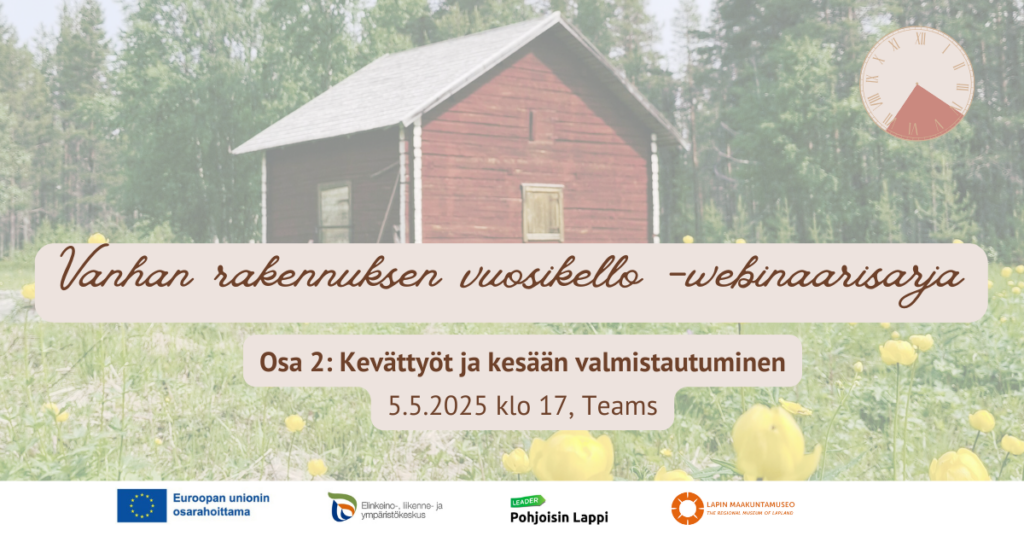 Tilaisuus on ensimmäinen osa Vanhan rakennuksen vuosikello -webinaarisarjaa, jossa perehdytään eri vuodenaikoina tehtäviin tarpeellisiin ylläpito- ja kunnostustöihin perinteisessä puutalossa. Webinaarisarjan toisessa osassa 5.5.2025 käydään läpi kevättöitä ja kesään valmistautumista.