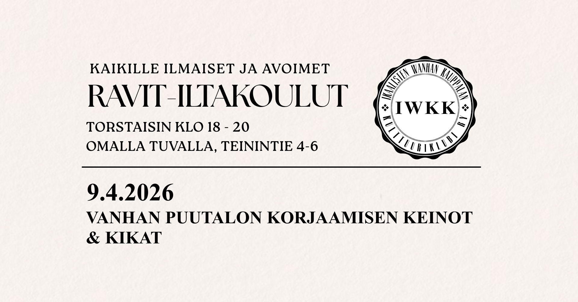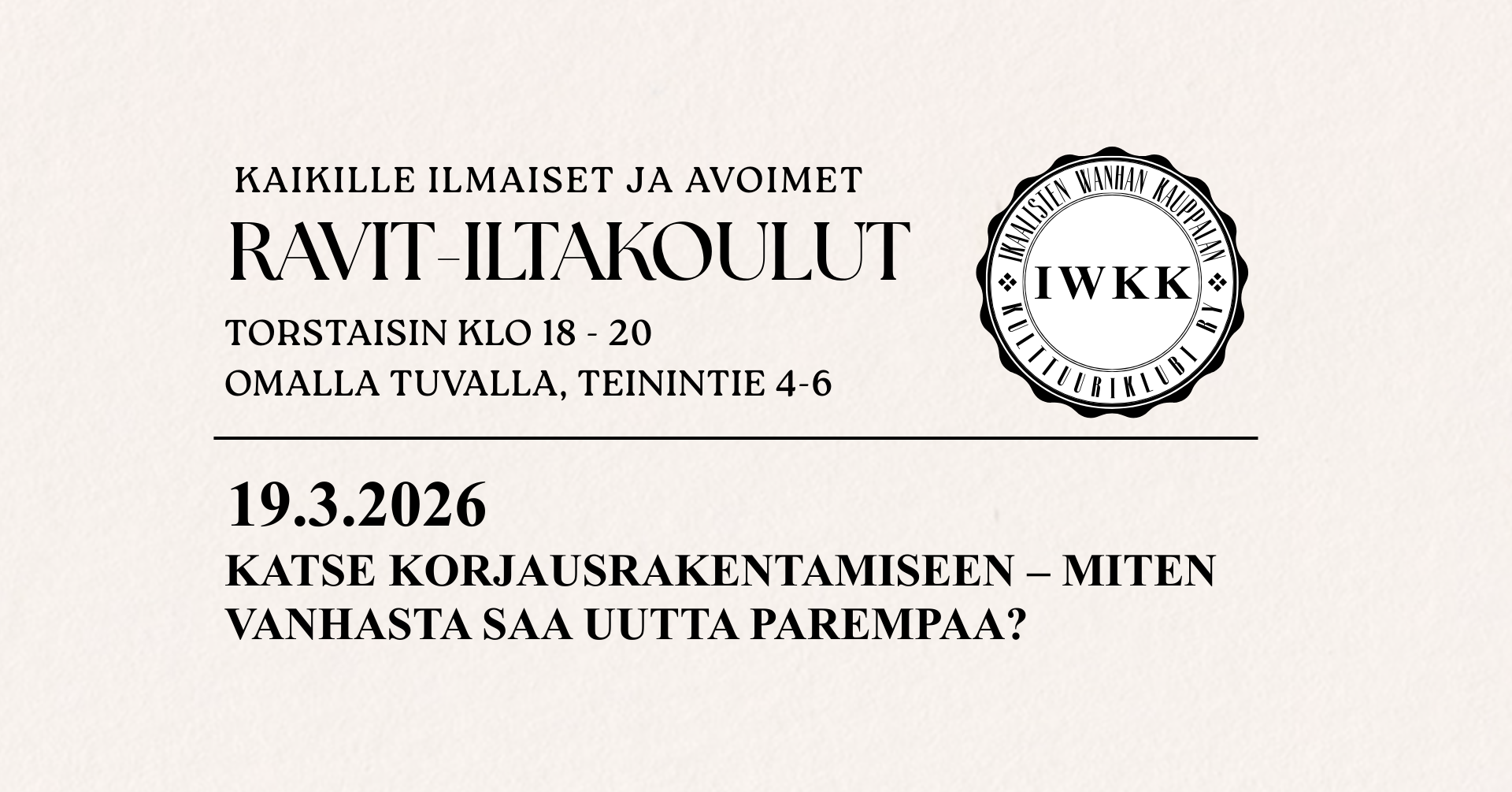 Oma Tupa Teinintie 4-6, 39500 IkaalinenRAVIT-iltakoulujen tavoitteena on lisätä ymmärrystä ja osaamista korjausrakentamisesta ja samalla nostaa tietoisuutta paikallisen rakennusperinnön arvosta. Tärkeä tavoite on myös luoda...