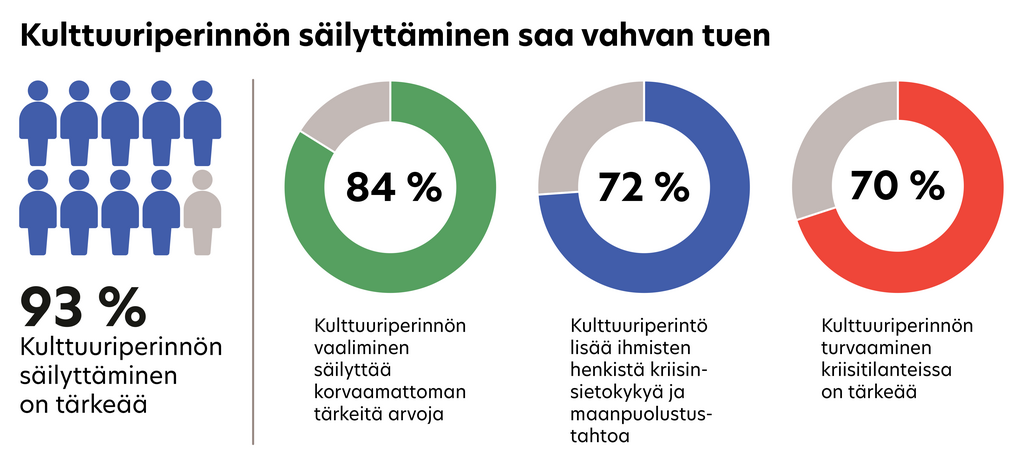 Tuoreen barometrin vastaajista 93 prosenttia pitää kulttuuriperinnön säilyttämistä erittäin tai melko tärkeänä. Vuonna 2017 vastaava luku oli 87 prosenttia. 70 prosenttia vastaajista kokee tärkeäksi, että kulttuuriperintö turvataan myös kriisitilanteissa.